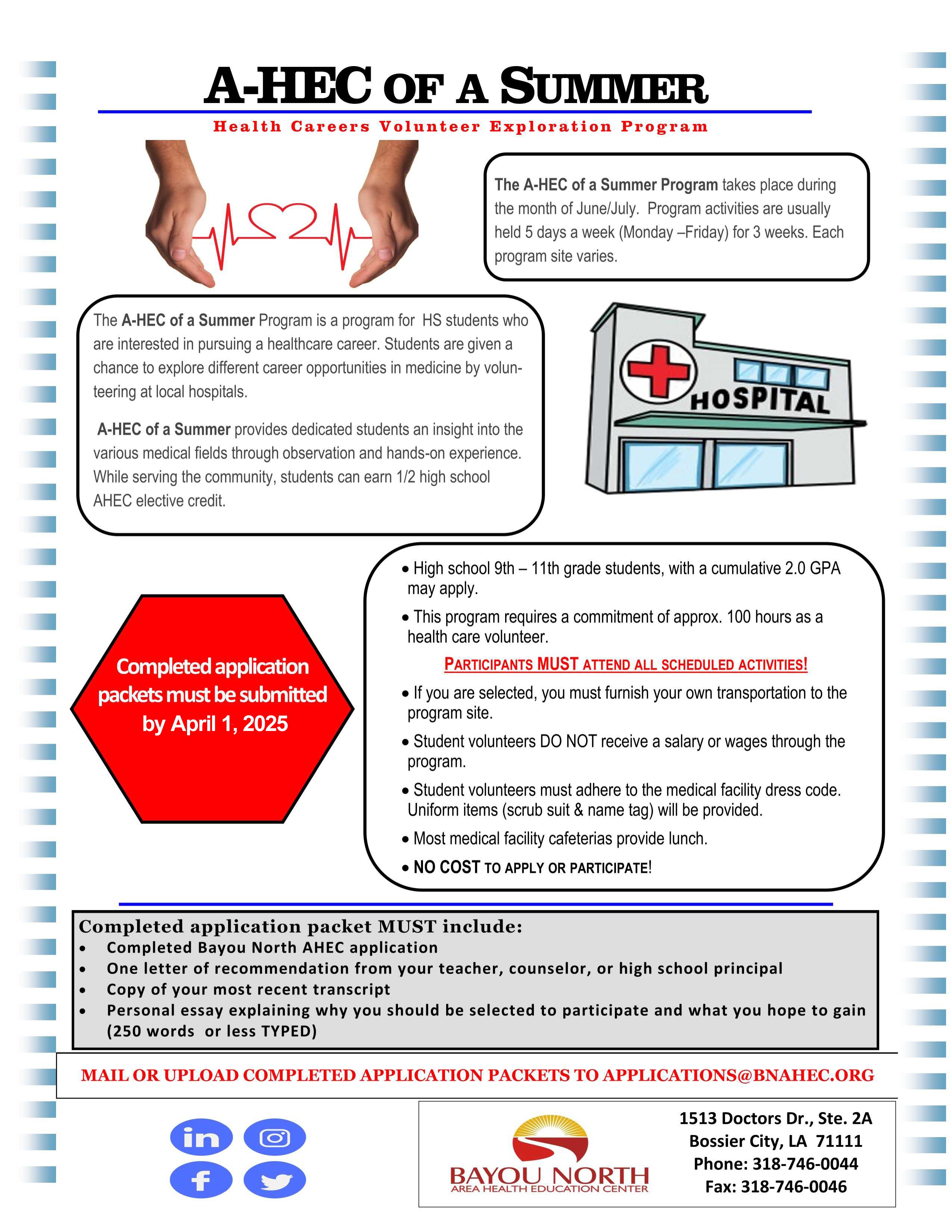 Do you know a High School student who plans to work in a medical field?  “AHEC of a Summer” is an opportunity for high school students interested in learning about health careers to gain hands-on experience. The AHEC of a Summer program is offered in 21 parishes in North Louisiana and sponsored by the Bayou North Area Health Education Center (AHEC), local health care facilities, and school boards.
